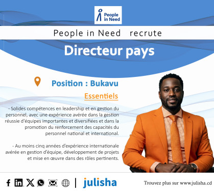 Le directeur pays (DP) est le principal représentant de People in Need (PIN) en RDC. Il est responsable de l'orientation stratégique globale et du leadership opérationnel. Il veille à ce que tous les programmes et opérations soient mis en œuvre conformément aux valeurs, aux politiques et à la stratégie de PIN, en accordant une attention particulière aux principes humanitaires et à la redevabilité. Il est responsable de la sécurité et de la gestion des risques, supervise les fonctions de soutien et veille à la gestion et au développement efficaces des ressources humaines (RH). Il agit en tant que représentant légal de PIN en RDC et joue un rôle clé dans la coordination avec les partenaires, les donateurs et les autorités locales. Ce poste est basé à Bukavu, avec des déplacements réguliers à Goma et à Kinshasa.