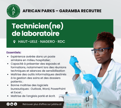 Le (la) Technicien(ne) Médical(e) de Laboratoire est chargé d'effectuer, de manière fiable et sécurisée, l'ensemble des examens de laboratoire nécessaires au diagnostic, au suivi et à la prise en charge des patients. Il veille au respect des normes de qualité, de sécurité et de déontologie médicale, conformément aux standards opérationnels d'African Parks. Il contribue activement au bon fonctionnement du service de laboratoire et à l'amélioration continue de la qualité des soins au sein de l'Hôpital de Nagero
