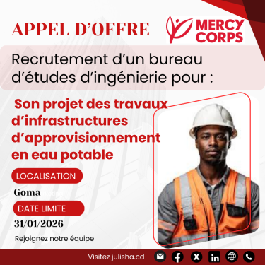 Mercy Corps lance une consultation pour le recrutement d’un bureau d’études d’ingénierie chargé de la mise à jour des études techniques et de la préparation des dossiers d’appel d’offres pour des travaux d’infrastructures d’approvisionnement en eau potable le long des axes à Sake et Bweremana, dans le cadre du projet SWAP-PED à Goma (RDC).