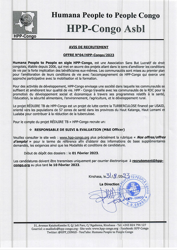Hpp-congo/responsable de suivi & evaluation (m&e officer)