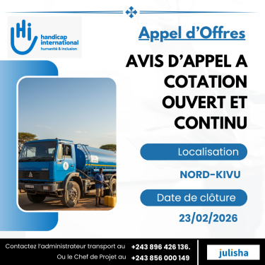 Dans ce cadre, Handicap International lance un appel à cotation pour renforcer sa base de données de transporteurs routiers locaux intervenant dans la région du Nord Kivu.